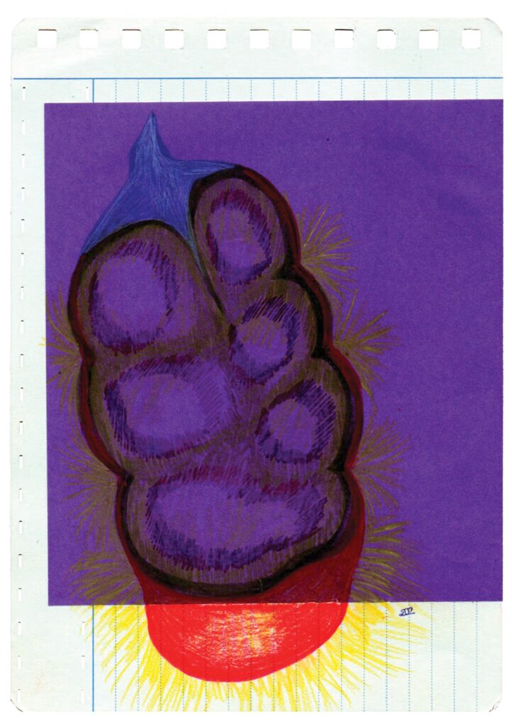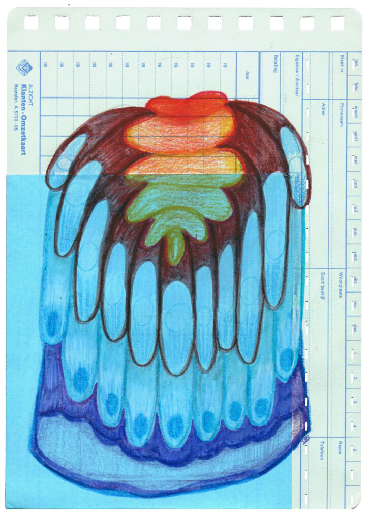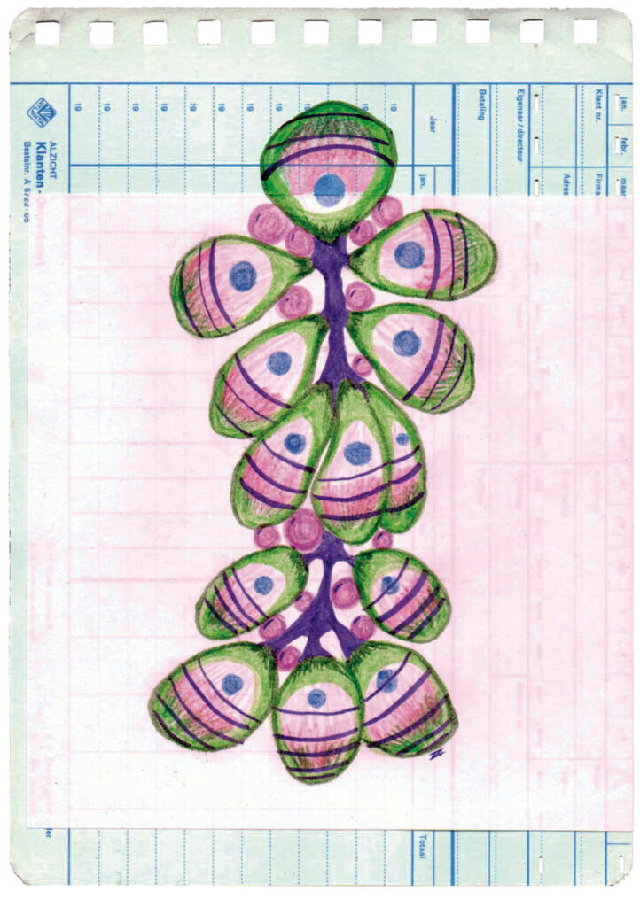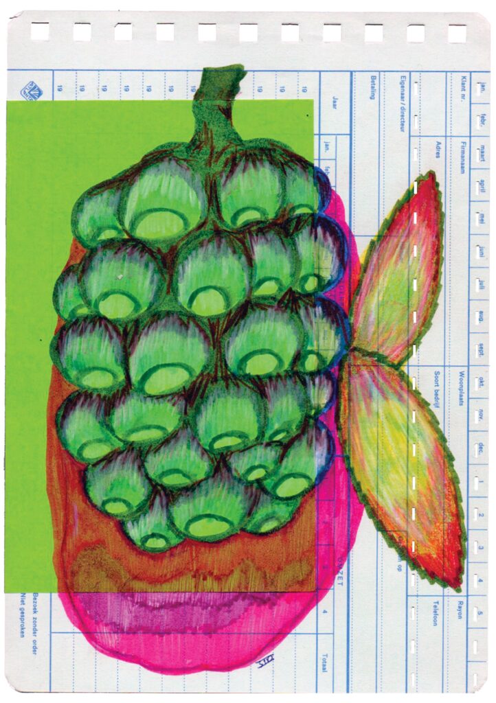 W#2 14,7 x 20,8 cm, old customer turnover card, Muji origami paper, coloured pencil, Pentel Touch Brush Sign Pen, 02/2026 1. sunny line rock 3. infected bloom 5. overgrown lines 7. giant berry tree 9. unripe berry bunch 11. ornament 2. purple seeded pepper 4. giant berry tree seed 6. petal branch 8. blue fruit flesh 10. overgrown tree stump 12. flower fossil