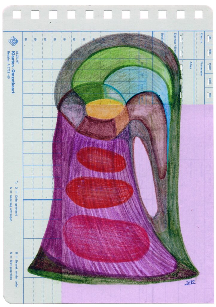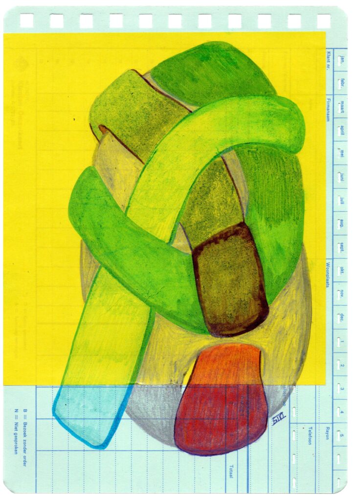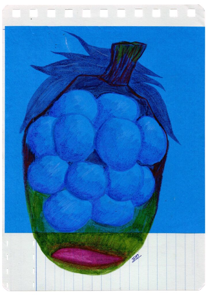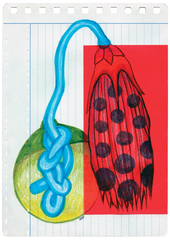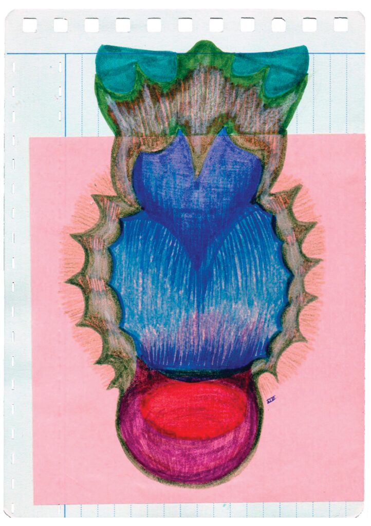 W#2 14,7 x 20,8 cm, old customer turnover card, Muji origami paper, coloured pencil, Pentel Touch Brush Sign Pen, 02/2026 1. sunny line rock 3. infected bloom 5. overgrown lines 7. giant berry tree 9. unripe berry bunch 11. ornament 2. purple seeded pepper 4. giant berry tree seed 6. petal branch 8. blue fruit flesh 10. overgrown tree stump 12. flower fossil